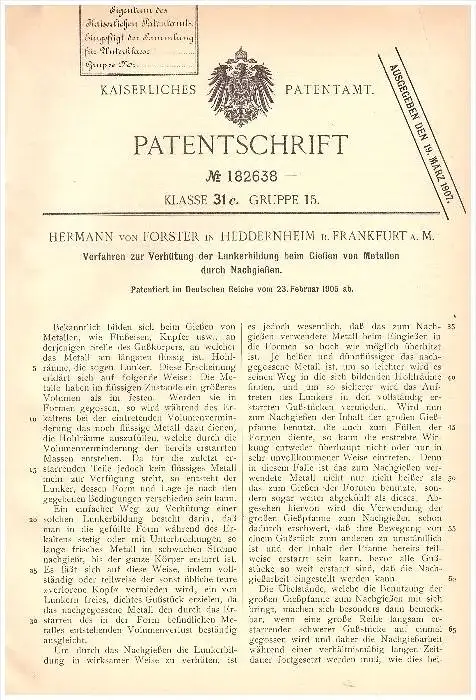 Original Patent - Hermann von Forster in Heddernheim b. Frankfurt a.M., 1905 , Verhütung von Lunkerbildung , Metallbau !