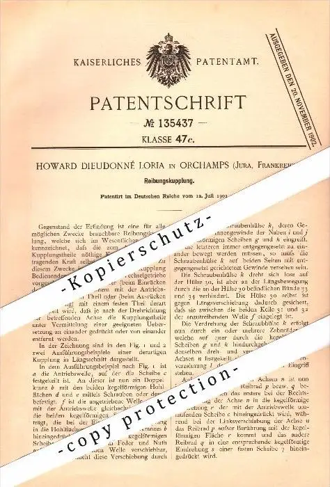 Original Patent - Howard Loria à Orchamps , Jura , 1901 , friction !!!