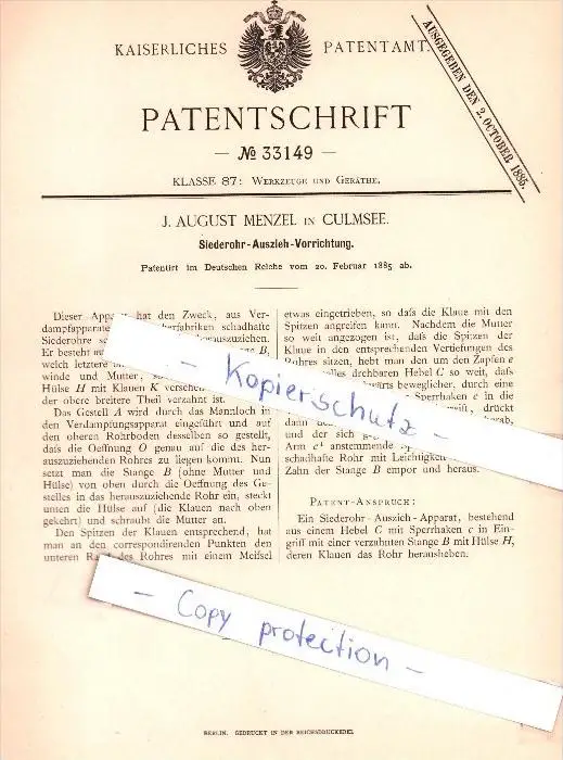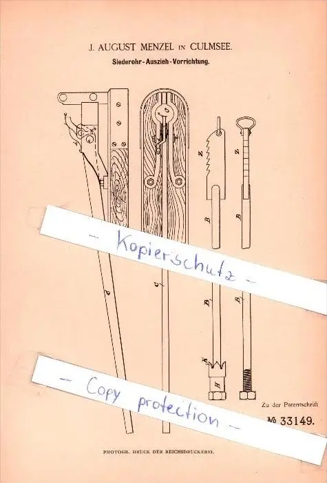 Original Patent - J. August Menzel in Culmsee , 1885 , Siederohr - Auszieh - Vorrichtung !!!