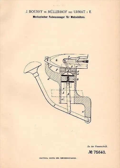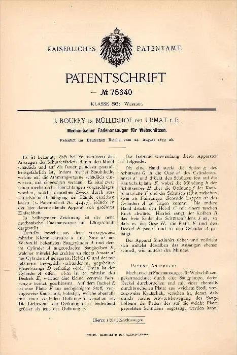 Original Patent - J. Bourry dans Müllerhof à Urmatt i. Elsass , 1893 , Appareil pour métier à tisser, tissage !!!
