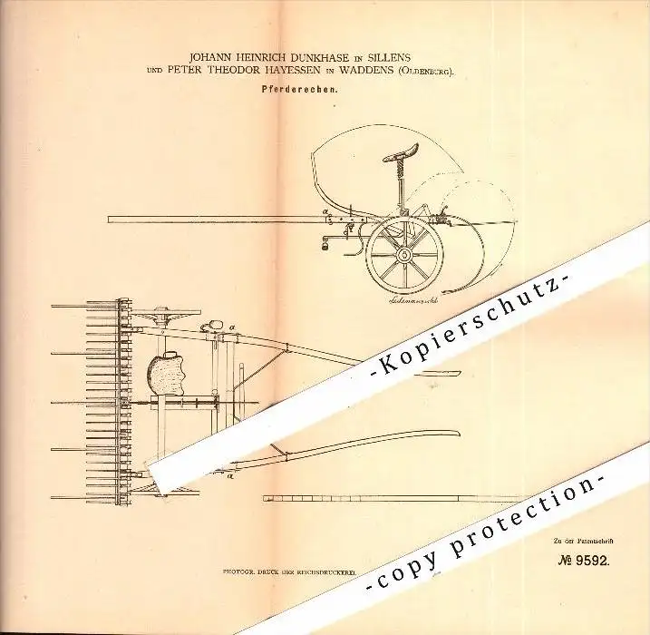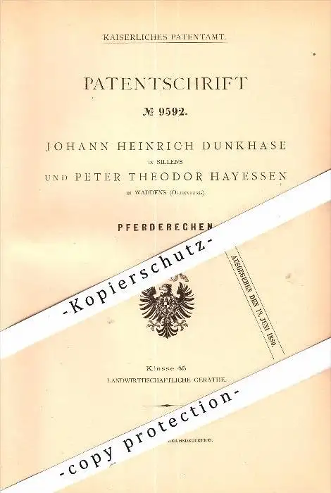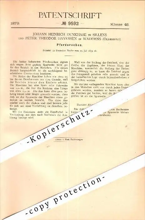 Original Patent - J. Dunkhase in Sillens und P. Hayessen in Waddens / Butjadingen ,1879, Pferderechen , Pferde , Burhave