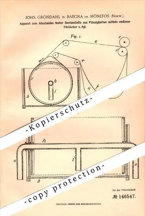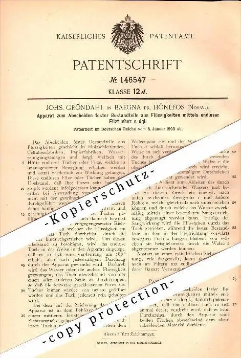 Original Patent - J. Gröhndal in Baegna b. Hönefoss , Norway , 1903 , Apparat für Papierfabrik , Hønefoss !!!