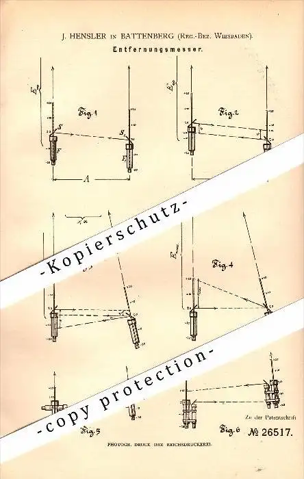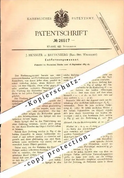 Original Patent - J. Hensler in Battenberg / Eder b. Wiesbaden , 1883 , Entfernungsmesser !!!