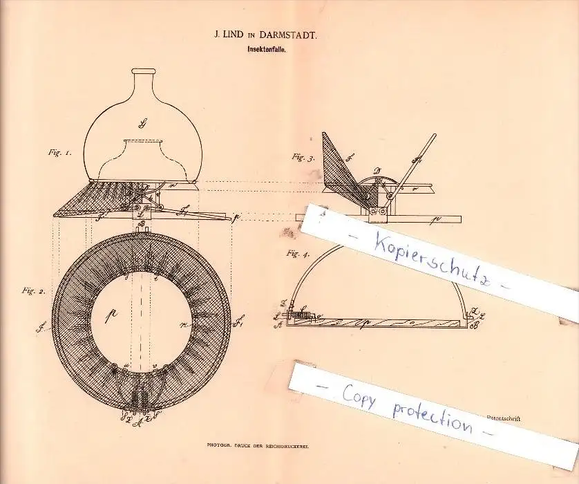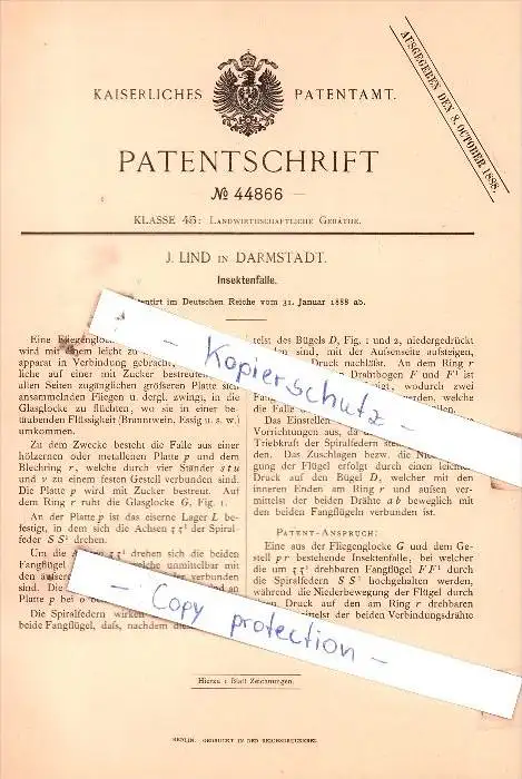 Original Patent - J. Lind in Darmstadt , 1888 , Insektenfalle !!!