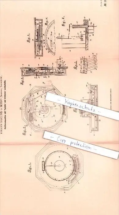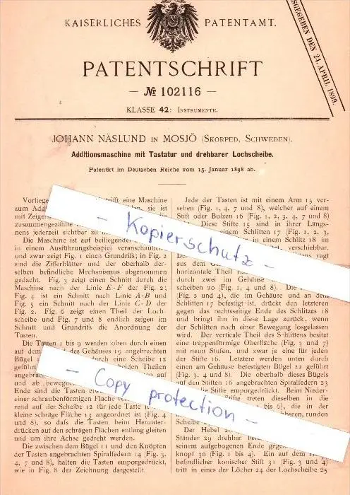 Original Patent - J. Näslund in Mosjö , Skorped , Schweden , 1898 , Additionsmaschine mit Tastatur !!!