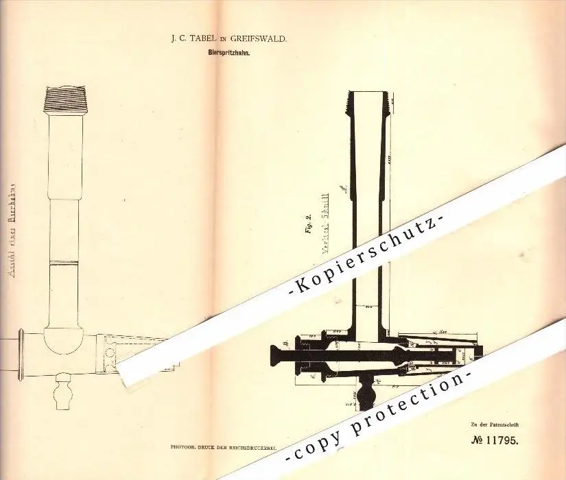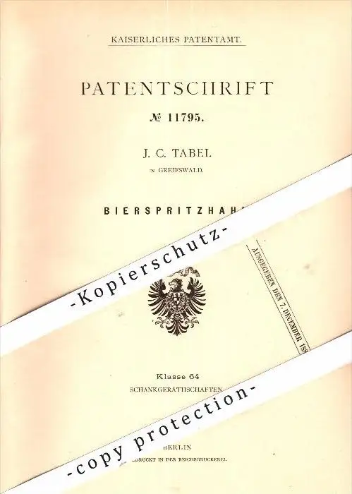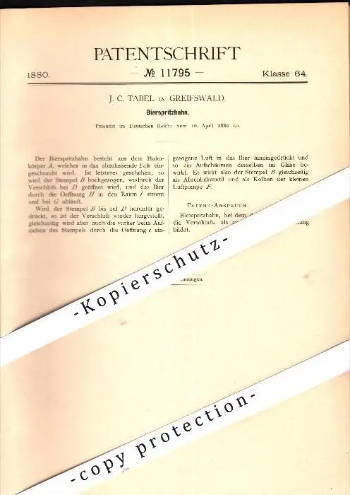 Original Patent - J.C. Tabel in Greifswald in Mecklenburg , 1880 , Bier-Spritzhahn , Brauerei , Alkohol , Kneipe !!!