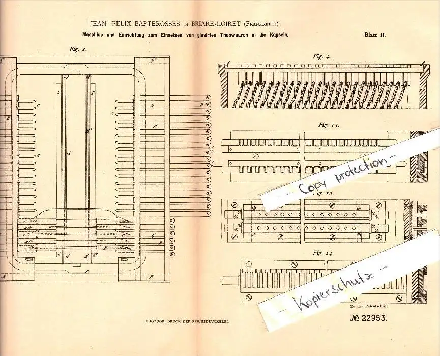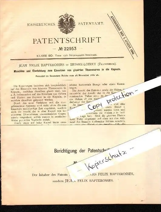 Original Patent - J.F. Bapterosses à Briare-Loiret , 1882 , Machine de plaque vitrée !!!