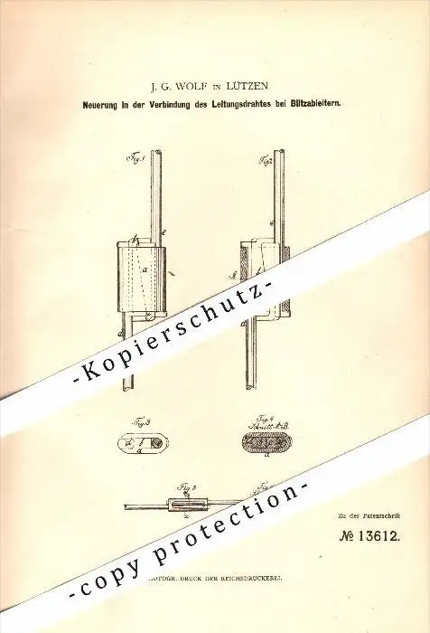 Original Patent - J.G. Wolf in Lützen , 1880 , Leitungsdraht für Blitzableiter , Hochbau , Bau !!!