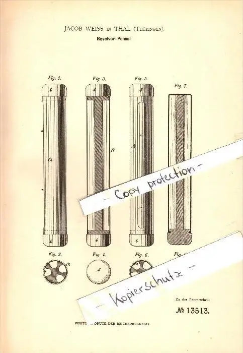 Original Patent - Jacob Weiss in Thal b. Ruhla i. Thüringen , 1880 , Revolver-Pennal !!!