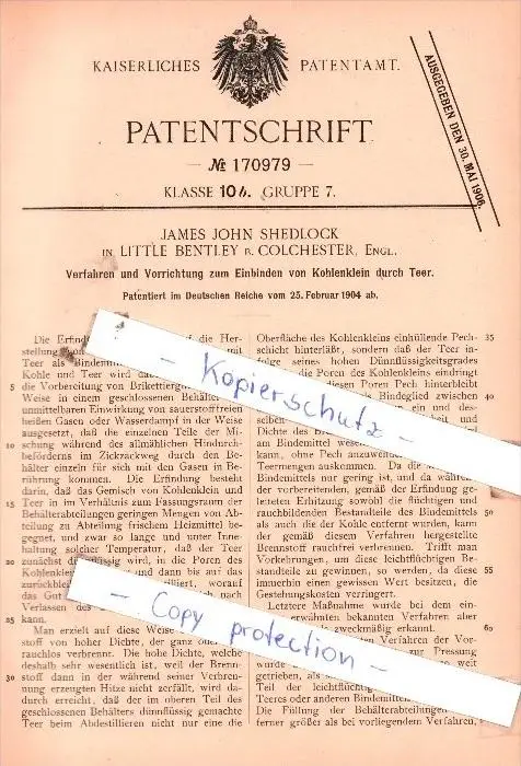 Original Patent - James John Shedlock in Little Bentley b. Colchester, Engl. , 1904 , !!!
