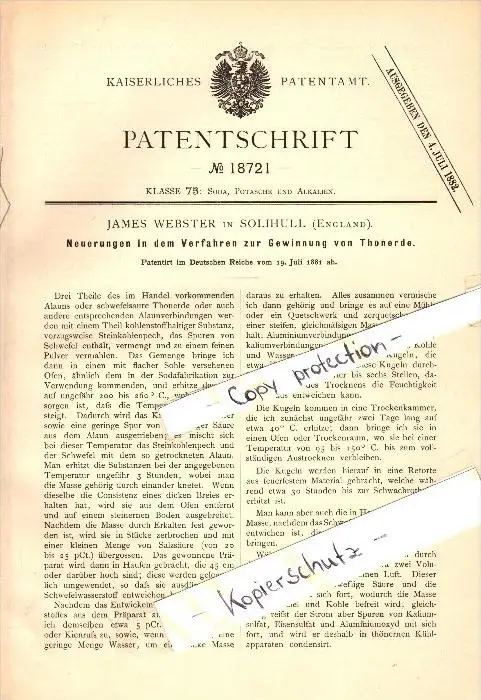 Original Patent - James Webster in Solihull , England , 1881 , Production of alumina !!!