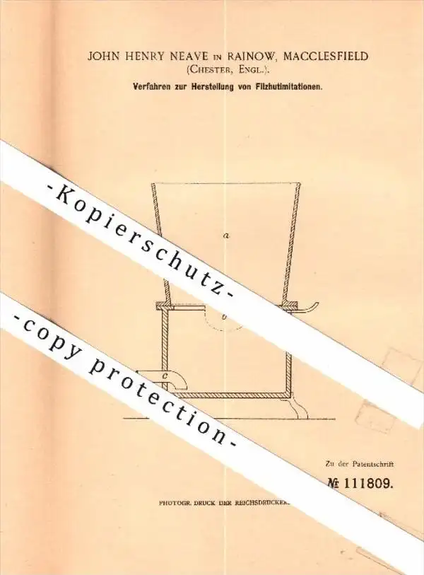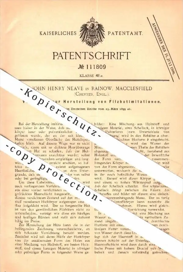Original Patent - John Henry Neave in Rainow , Macclesfield , 1899 , Manufacture of felt hats !!!