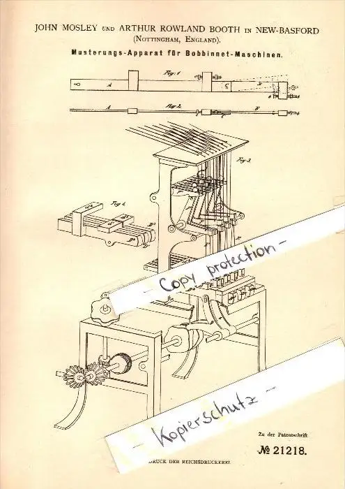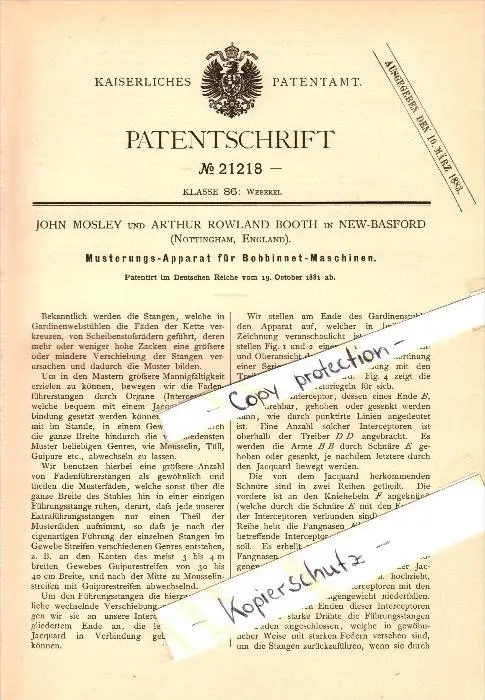 Original Patent - John Mosley and Arthur Booth in New Basford , 1881 , Pattern apparatus for weaving !!!