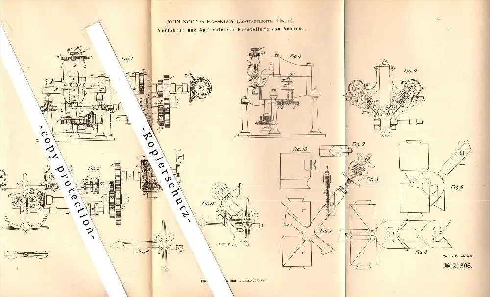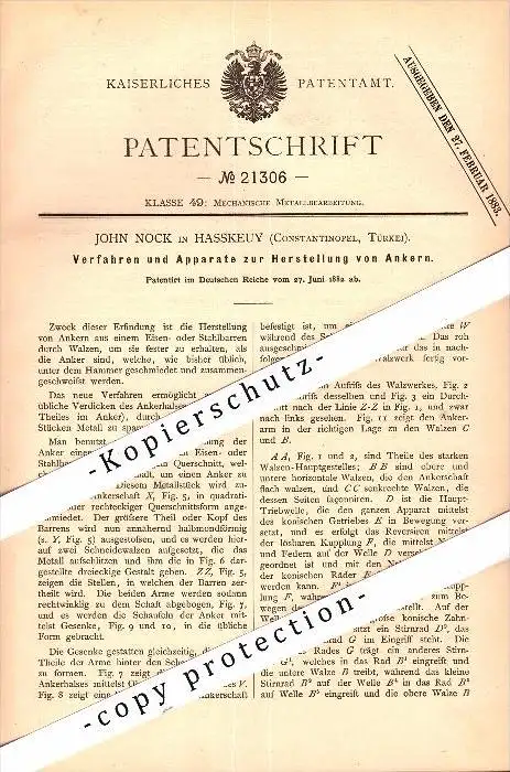 Original Patent - John Nock in Hassköy b. Istanbul , Türkei , 1882 , Apparat zur Anker-Herstellung , Konstantinopel !!!