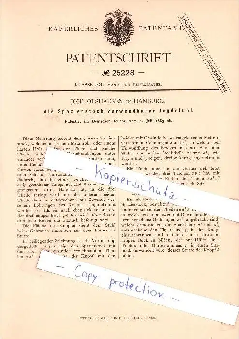 Original Patent - Johs Olshausen in Hamburg , 1883 , Als Spazierstock verwendbarer Jagdstuhl , Jagd , Jäger !!!