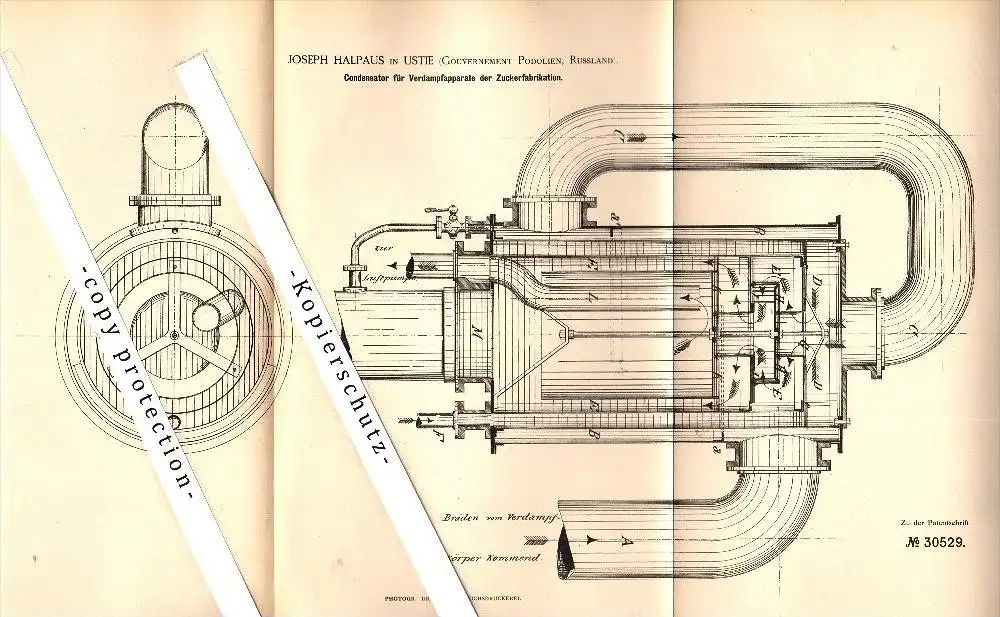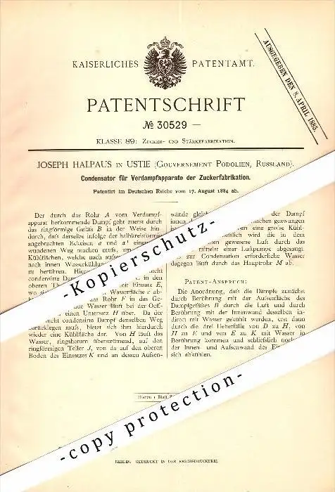 Original Patent - Joseph Halpaus in Ustie , Gouvernement Podolien , 1884 , Kondensator für Zuckerfabrik , Russland !!!