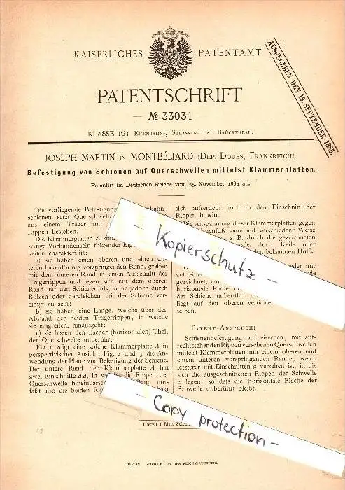 Original Patent - Joseph Martin à Montbéliard , Doubs , 1884 , La fixation des rails , chemin de fer !!!