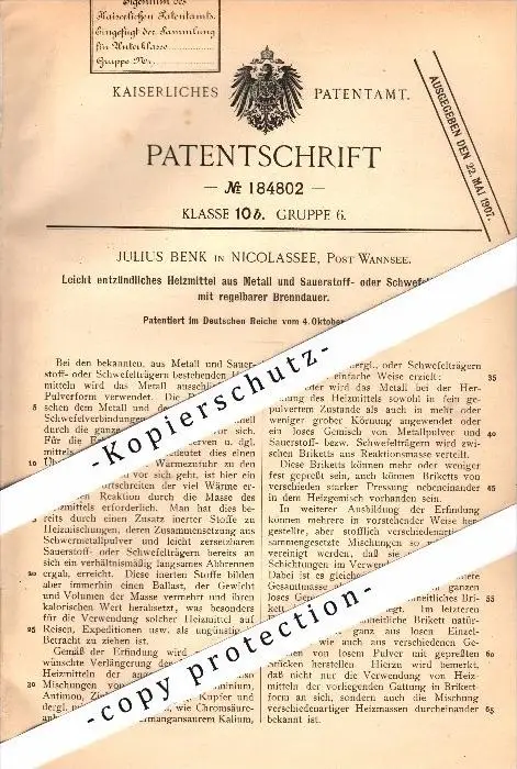 Original Patent - Julius Benk in Berlin-Nikolassee , Post Wannsee , 1905 , leicht entzündliches Heizmittel aus Metall !!