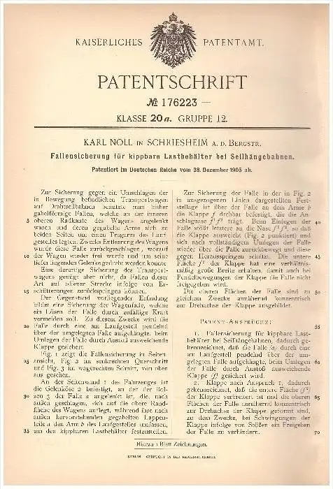 Original Patent - Karl Noll in Schriesheim a.d. Bergstraße, 1905 , Fallensicherung für Seilbahn , Hängebahn !!!