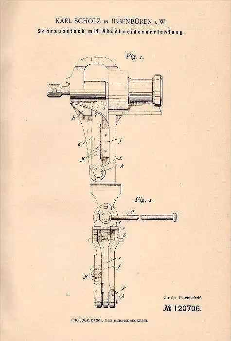 Original Patent - Karl Scholz in Ibbenbüren i.W. , 1900 , Schraubstock mit Abschneidevorrichtung !!!