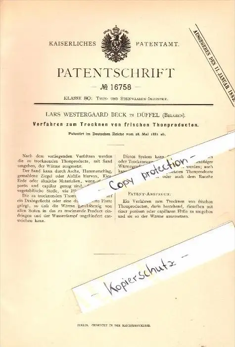 Original Patent - Lars Westergaard Beck in Duffel / Mechelen , 1881 , Trocknen von frischem Thon , Keramik !!!