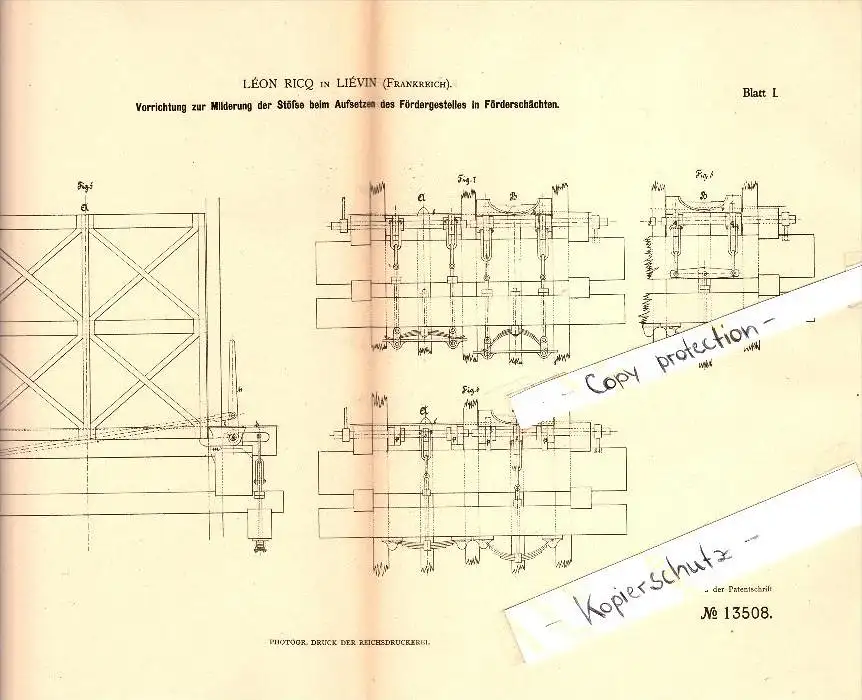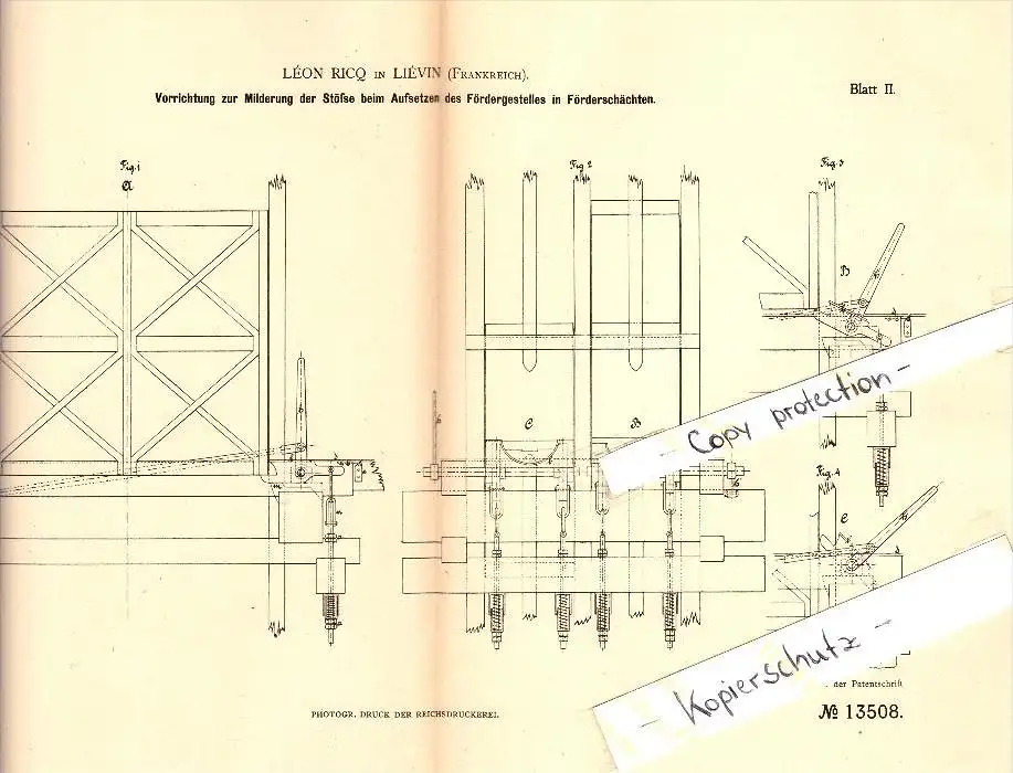 Original Patent - Léon Ricq à Liévin , 1880 , La réduction de choc pour cages , exploitation minière !!!
