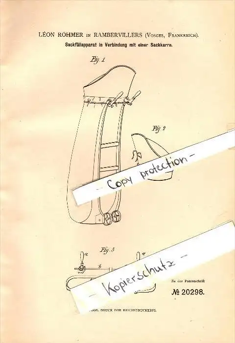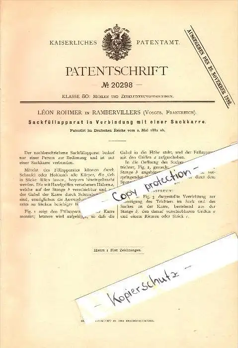 Original Patent - Léon Rohmer à Rambervillers , Vosges , 1882 , Dispositif de remplissage Sac !!!