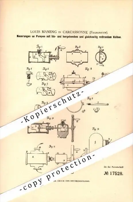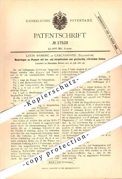 Original Patent - Louis Maneng à Carcassonne , 1881 , Pompes à pistons rotatifs !!!