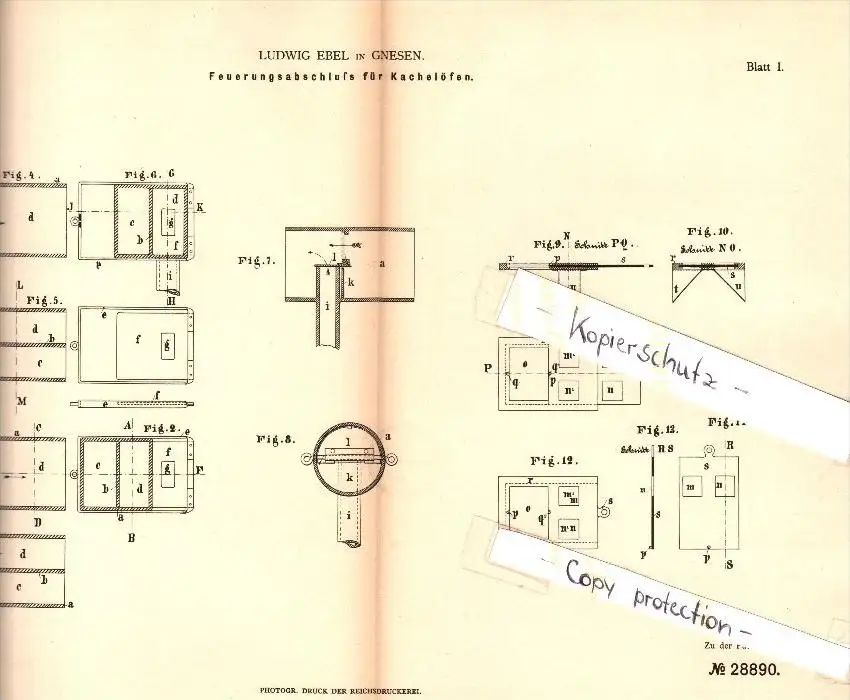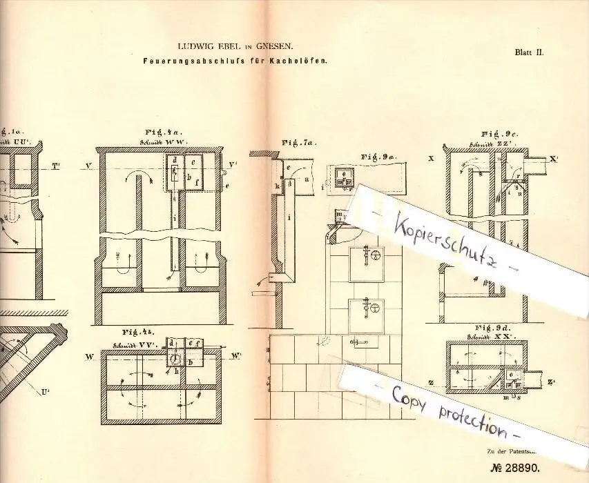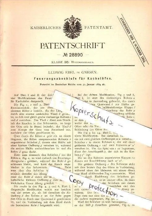 Original Patent - Ludwig Ebel in Gnesen / Gniezno , 1884 , Feuerung für Kachelofen , Ofen !!!