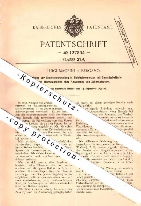 Original Patent - Luigi Magrini in Bergamo , Italia , 1899 , Regolatori di tensione per CC !!!