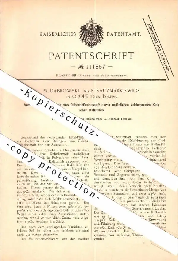 Original Patent - M. Dabrowski und E. Kaczmarkiewicz in Opole / Oppeln , 1899 , Reinigung von Rübensaft !!!