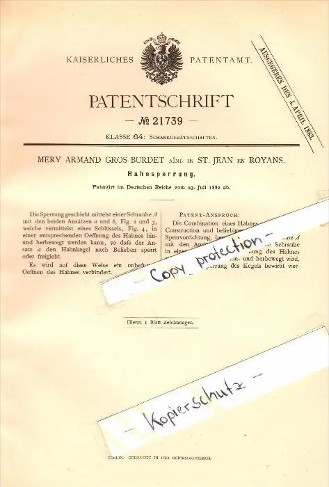 Original Patent - M.A. Gros-Burdet à Saint-Jean-en-Royans , 1882 , Verrouillez sur le robinet !!!
