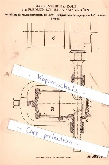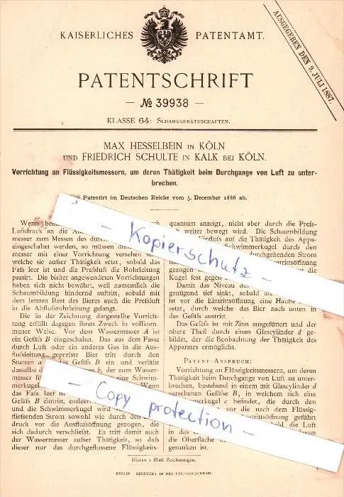 Original Patent - Max Hesselbein in Köln und Friedrich Schulte in Kalk bei Köln , 1886 , !!!