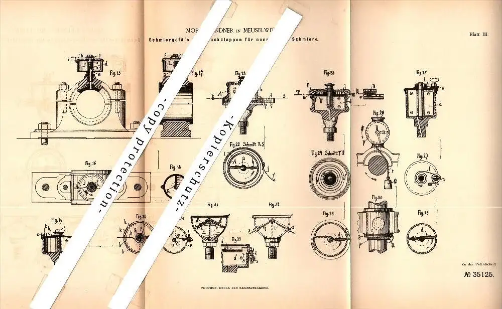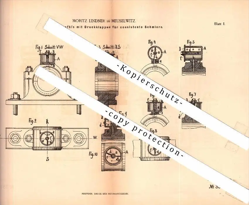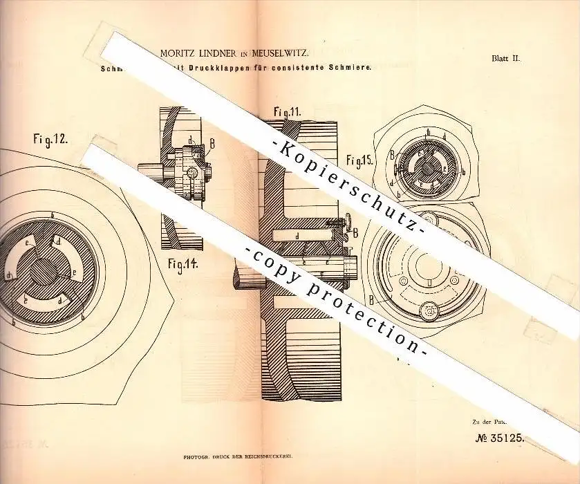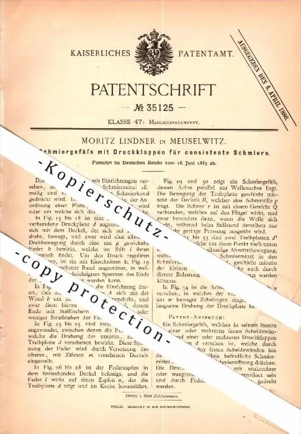 Original Patent - Moritz Lindner in Meuselwitz , 1885 , Schmiergefäß mit Druckklappen , Maschinenbau !!!