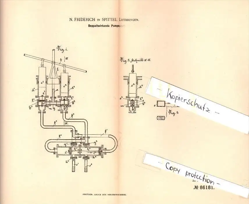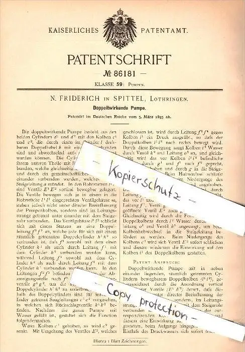 Original Patent - N. Friderich à Spittel / Spitel , Lothringen , 1895 , pompe à double effet !!!