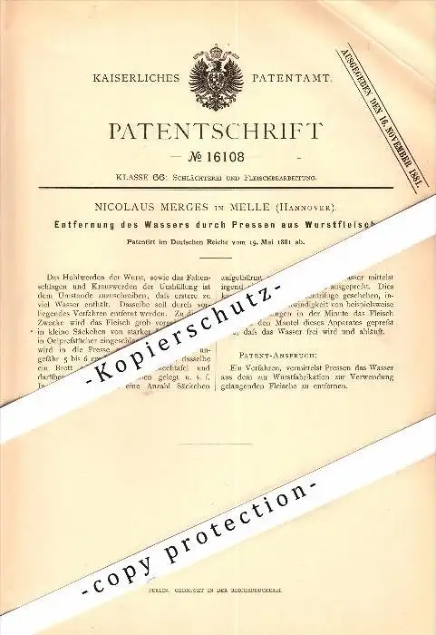 Original Patent - Nicolaus Merges in Melle b. Hannover , 1881 , Wasserentfernung bei Wurst , Schlachter , Metzger !!!