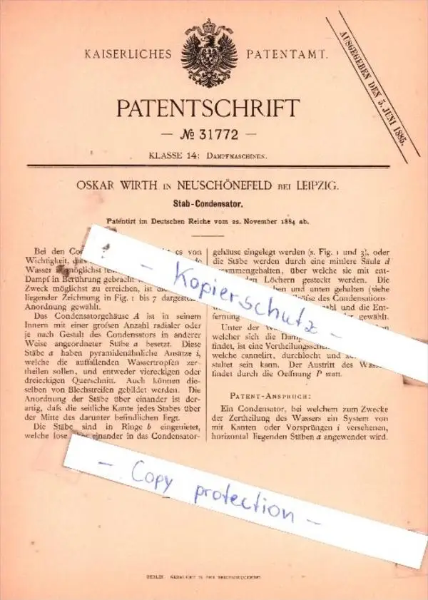Original Patent - Oskar Wirth in Neuschönefeld bei Leipzig , 1884 , Dampfmaschinen !!!