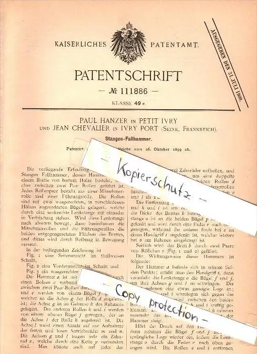 Original Patent - P. Hanzer à Petit Ivry et J. Chevalier à Ivry Port , 1899 , Tomber Marteau , Ivry-sur-Seine !!!
