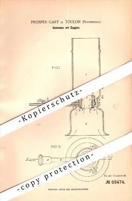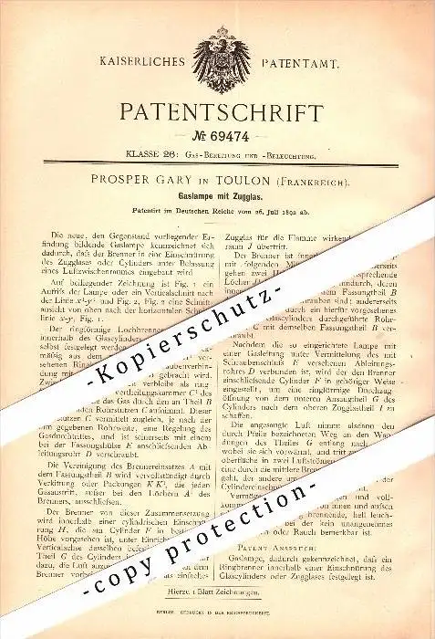 Original Patent - Prosper Gary à Toulon , 1892 , Lampe à gaz !!!
