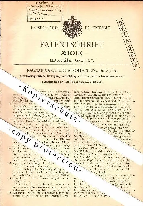Original Patent - Ragnar Carlstedt in Kopparberg , Schweden , 1905 , Elektromagnetischer Apparat , Ljusnarsberg !!