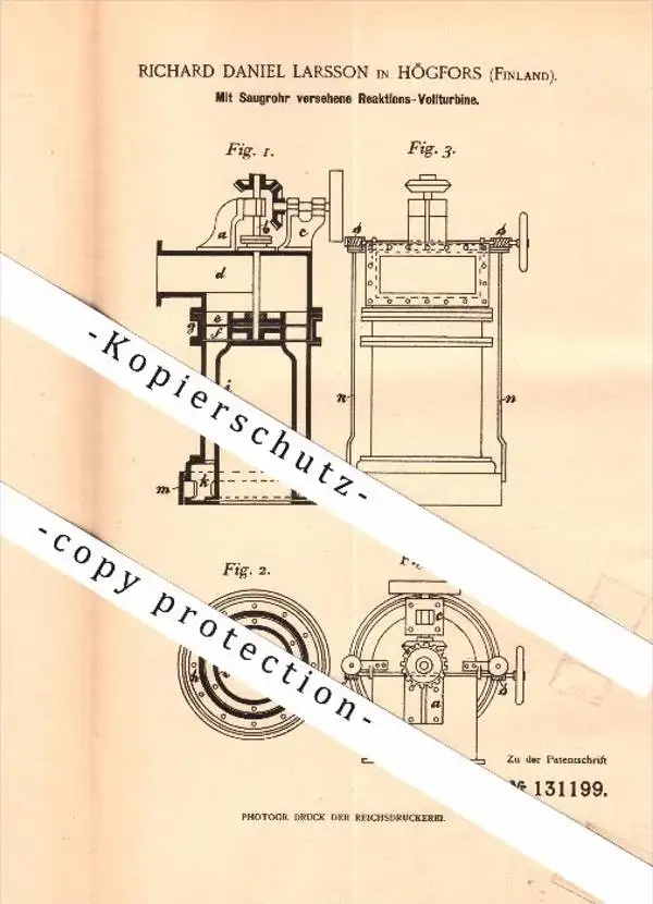 Original Patent - Richard D. Larsson in Högfors , Finnland , 1901 , Reaktions - Vollturbine !!!