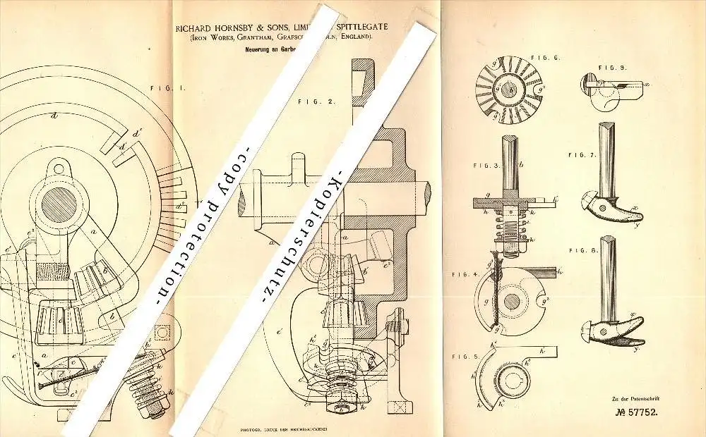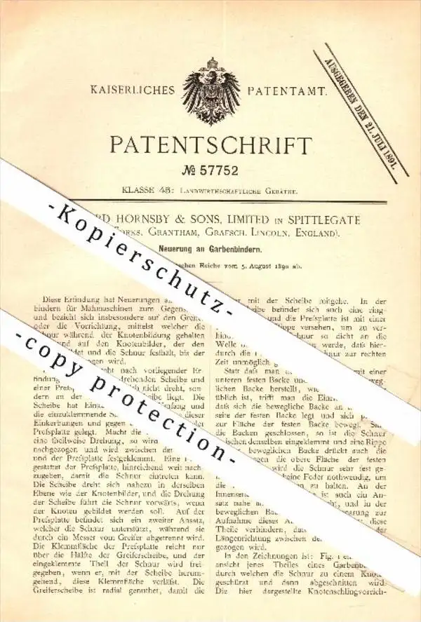 Original Patent - Richard Hornsby & Sons in Spittlegate , Lincolnshire , 1890 , Sheaf Binder of Agriculture !!!