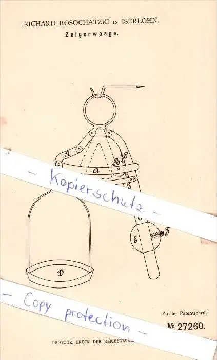 Original Patent - Richard Rosochatzki in Iserlohn , 1883 , Zeigerwaage !!!