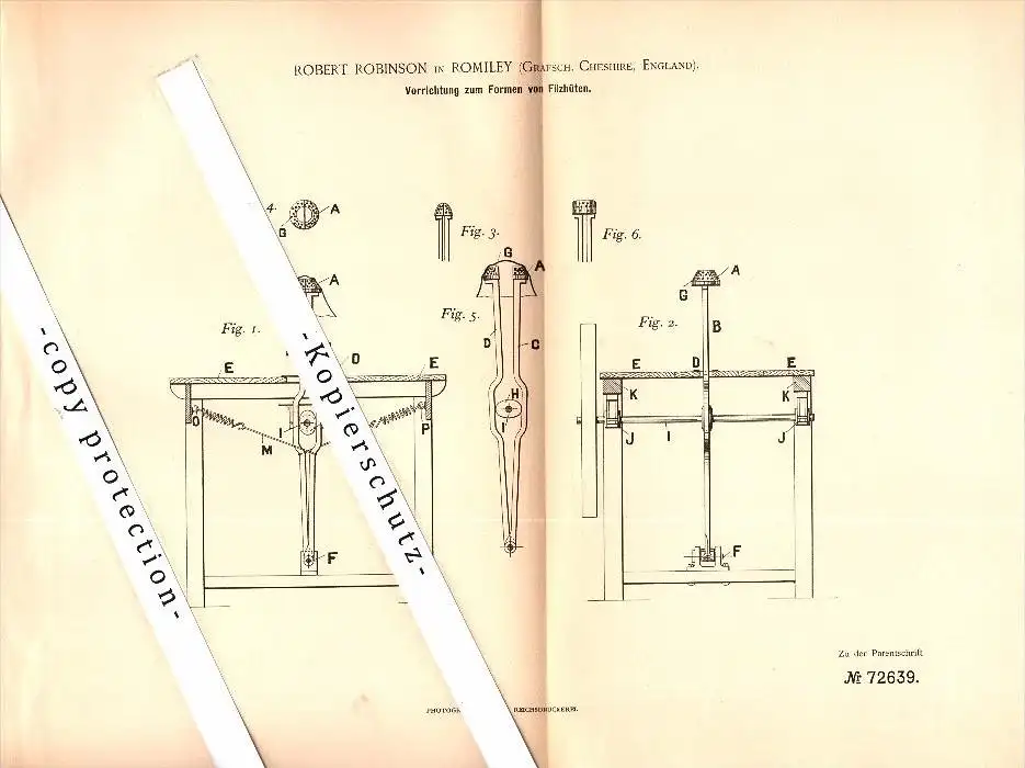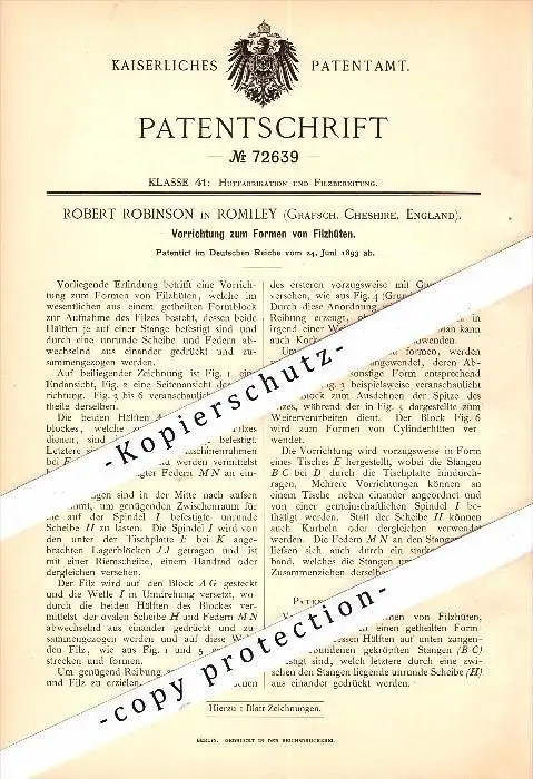 Original Patent - Robert Robinson in Romiley , Cheshire , 1893 , Apparatus for shaping of felt hats , Stockport !!!