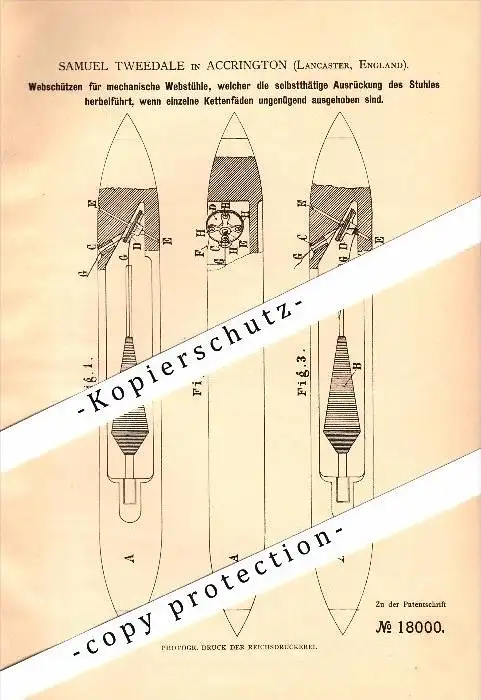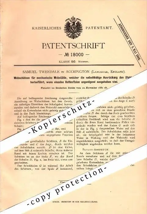 Original Patent - Samuel Tweedale in Accrington , Lancashire , 1881 , loom , Apparatus for weaving !!!