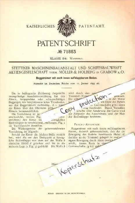 Original Patent - Schiffsbauwerft AG, Möller & Holberg in Grabow a.O. b. Stettin , 1893 , Baggereimer , Bagger !!!