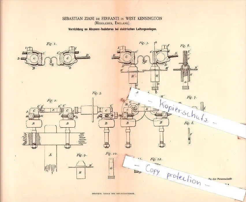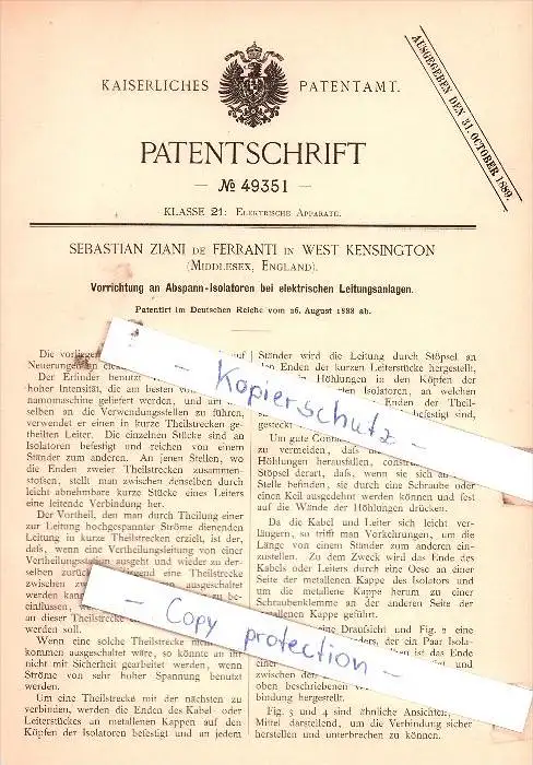Original Patent - Sebastian Ziani de Ferranti in West Kensington , 1888 , Elektrische Apparate !!!