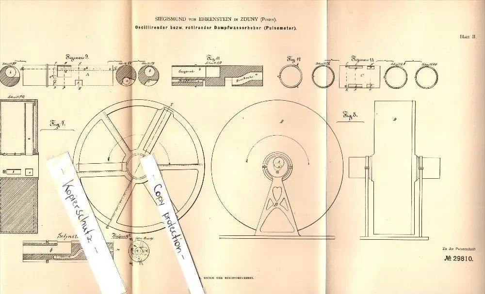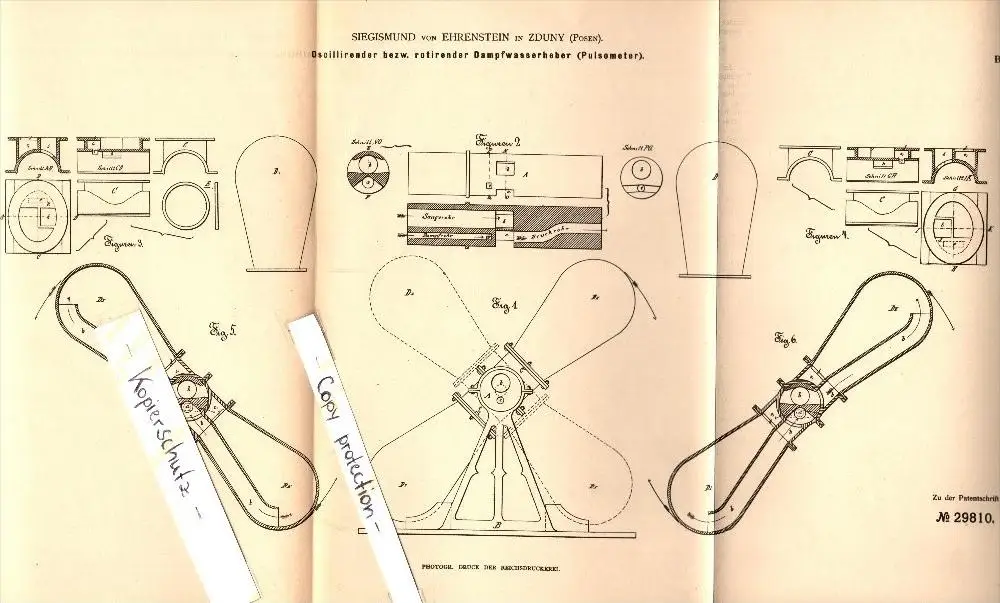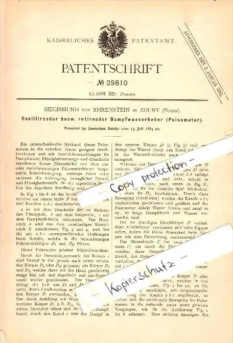 Original Patent - Siegismund von Ehrenstein in Zduny , 1884 , oszilierender Dampfwasserheber !!!
