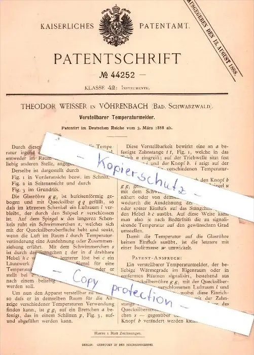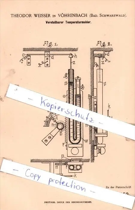 Original Patent - T. Weisser in Vöhrenbach , Bad. Schwarzwald , 1888 , Temperaturmelder !!!