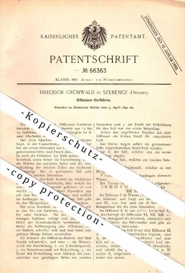 Original Patent - Theodor Grünwald in Szerencz / Szerencs , Ungarn , 1892 , Diffusions-Verfahren , Zuckerfabrik !!!